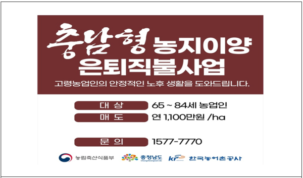 공사는 “고령 농업인들이 노후의 경제적 상황에 대한 걱정을 덜고 편안한 생활을 할 수 있도록 ‘충남형 농지이양 은퇴직불사업’을 적극 추진하겠다”고 말했다.