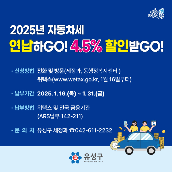 납부 대상은 2025년 1월 기준 자동차등록원부상 관내 차량 소유자 중 2024년에 연납했던 기존 납세자와 신규 신청자로, 신청은 16일부터 유성구 세정과, 각 동 행정복지센터, 위택스를 통해 할 수 있다.