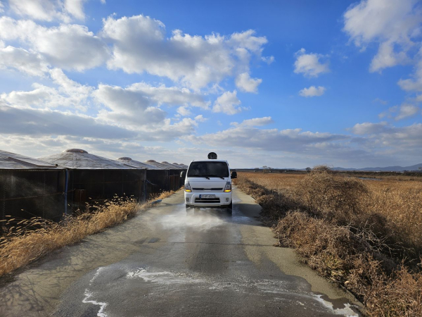 철새도래지인 AB지구 간척지 도로를 매일 소독하는 방역차량