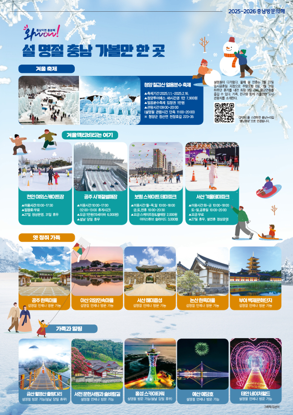 이번에 배부한 설 명절 충남 가볼 만한 곳 안내 책자에는 ▲겨울 축제 ▲겨울 체험·활동(액티비티) ▲옛 정취 가득 ▲가족과 힐링 등 4개 주제별 대표 관광 명소 15곳을 담아 남녀노소 누구나 자신에게 맞는 여행지를 찾아 즐길 수 있도록 다양한 선택지를 제공한다.