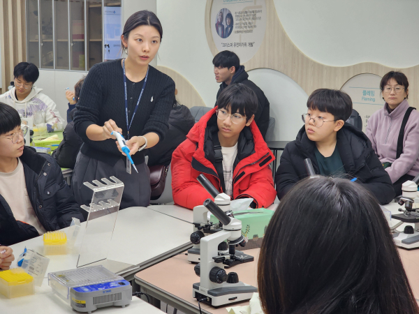 이날 교육에서는 ‘DNA 전기영동’을 주제로 학생들이 직접 마이크로 피펫을 활용해 DNA 시료를 주입해 보고 전기영동을 통해 DNA를 크기별로 관찰하는 체험이 이뤄졌으며, 학생들은 이외 다양한 체험을 통해 생명공학 분야를 심도 있게 이해할 수 있는 시간을 보냈다.