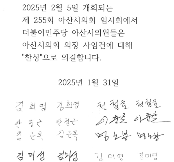 민주당 아산시의원들 “의장 사임에 전원 찬성”