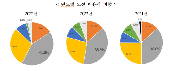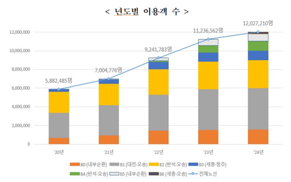 분석 결과, 2024년 노선별 연간 이용객 비중은 B1(대전~오송)이 36.6%, B2(반석~정부청사~오송)이 25.0%, B0(내부순환)이 13.3%로 3개 노선의 이용 비중이 75%에 달하는 것으로 나타났다.