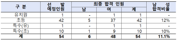 유치원 1명, 초등 42명, 특수(유) 1명, 특수(초) 10명, 총 54명 합격
