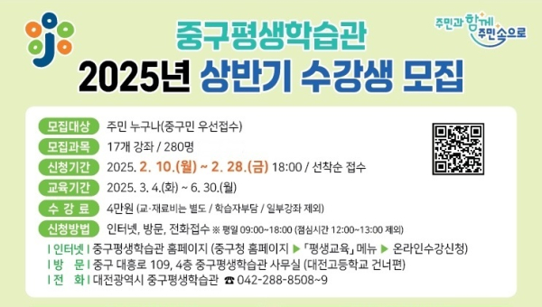 [충청뉴스 박영환 기자] 대전 중구(구청장 김제선)는 이달 말까지 2025년 상반기 중구평생학습관 프로그램 수강생을 선착순 모집한다고 10일 밝혔다.