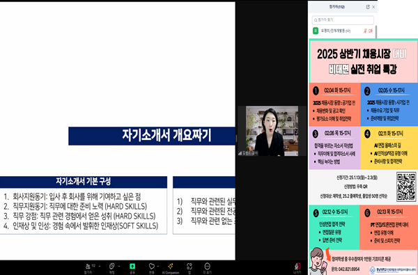 충남대 인재개발원 대학일자리플러스센터는 지난 4일부터 13일까지 충남대 재학생과 졸업생, 지역 청년 등 600여 명이 참여한 가운데 총 6회에 걸쳐 ‘2025년 상반기 채용시장 대비 실전 취업특강’을 비대면 방식으로 운영했다.