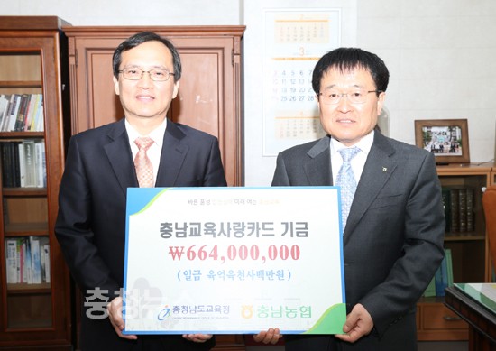 충남교육청은 1일 지난해 충남교육사랑카드 사용으로 모아진 기금 6억6400만원을 농협충남지역본부(본부장 김병문)로부터 전달 받았다.