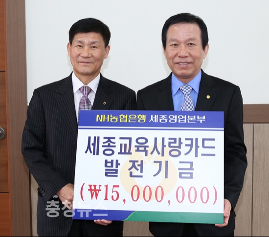 세종특별자치시교육청(교육감 신정균)은 1일 오전 세종시교육청에서 백학현 농협 세종본부장으로 부터 NH세종교육사랑카드 발전기금 1천5백만 원을 전달받아 학생 장학금 등 학생복지에 쓰기로 했다고 밝혔다.