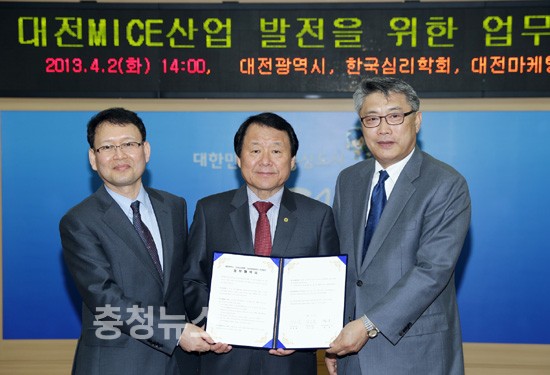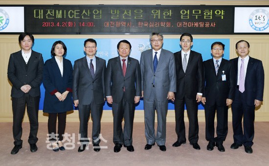 대전시와 한국심리학회, 대전마케팅 공사는 2일 오후 시청 중회의실에서 염홍철 대전시장, 김교헌 한국심리학회장, 채훈 대전마케팅공사장 등 10여명이 참석한 가운데‘대전MICE산업 상생발전을 위한 업무협약’을 체결했다.