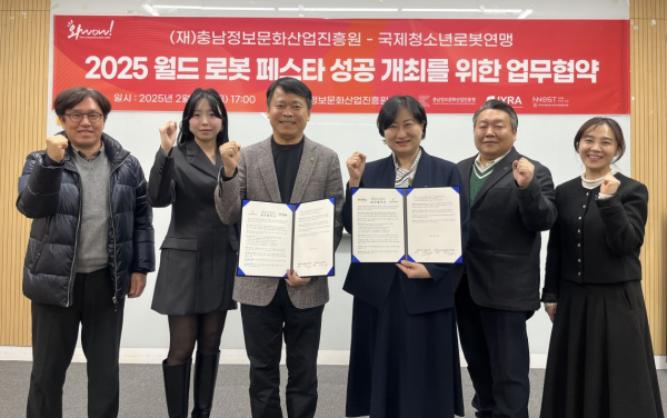 [충청뉴스 박동혁 기자] 충남정보문화산업진흥원(진흥원)은 최근 국제청소년로봇연맹과 ‘2025 월드 로봇 페스타 성공 개최’를 위한 업무협약을 체결했다고 24일 밝혔다.