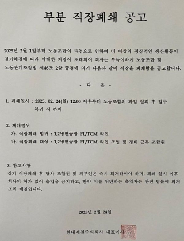 [충청뉴스 최형순 기자] 현대제철이 노조의 과도한 성과급 요구와 반복되는 파업에 맞서 창사 이래  '부분 직장 폐쇄'라는 초강수를 뒀다.