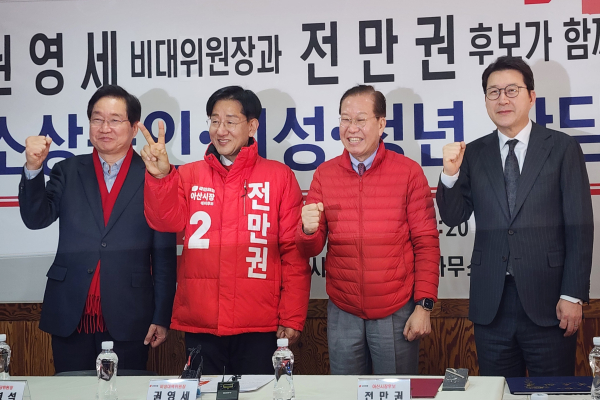 [충청뉴스 박동혁 기자] 권영세 국민의힘 비상대책위원장은 26일 4·2 재보궐선거를 앞두고 전만권 아산시장 예비후보를 만나 "당선 후 첫날부터 아산을 위해 뛸 분"이라며 "아산 발전시킬 적임자"라고 치켜세웠다.