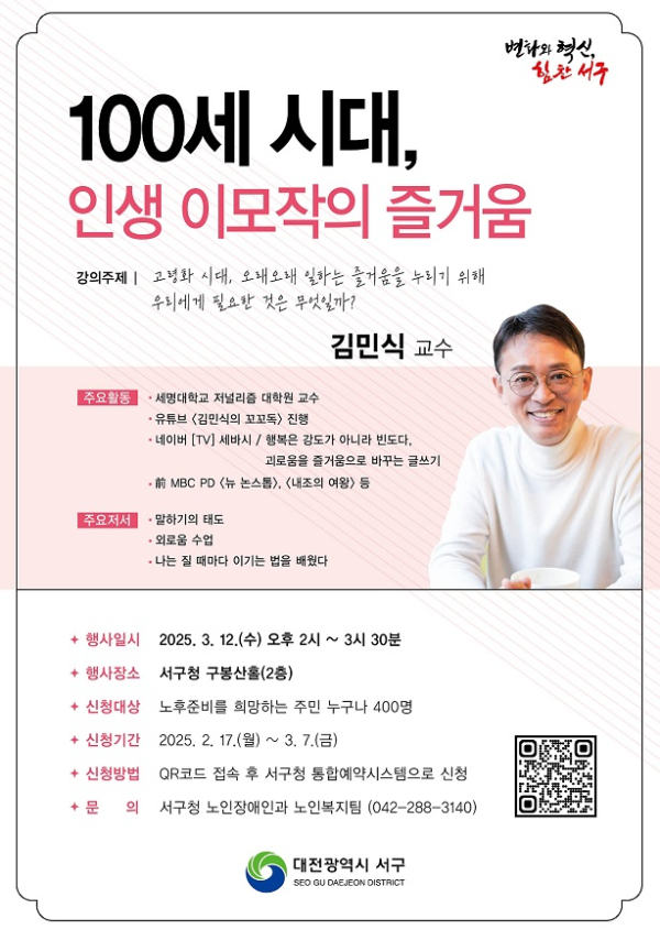 강의는 당일 수요일 오후 2시 서구청 2층 구봉산홀에서 개최되며 유튜브 '김민식의 꼬꼬독'과 네이버 TV '세상을 바꾸는 시간 15분'에서 노후 준비 관련 강의를 진행하고 있는 세명대학교 저널리즘 대학원 김민식 교수가 진행한다.