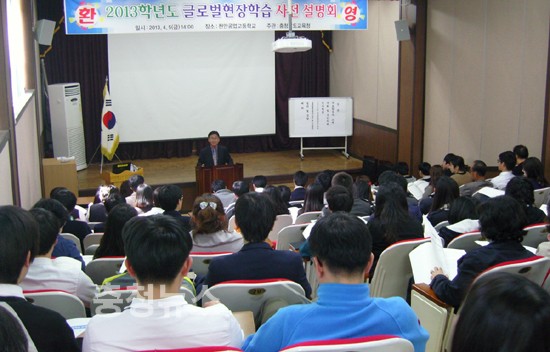 이날 사전설명회는 2013학년도 글로벌현장학습 프로그램 설명, 글로벌현장학습 준비 및 지도방안 등을 안내하기 위해 마련됐으며, 충청남도평생교육진흥원 윤은기 팀장은 ‘정부의 글로벌현장학습 방향’, ‘학생들의 글로벌 역량강화 방법 모색과 학생 지도방안’ 등을 주제로 특강을 해 큰 호응을 얻었고 교사와 학생, 학부모와의 질의응답 시간을 통해 가지고 있던 궁금증을 해소하는 계기가 됐다.