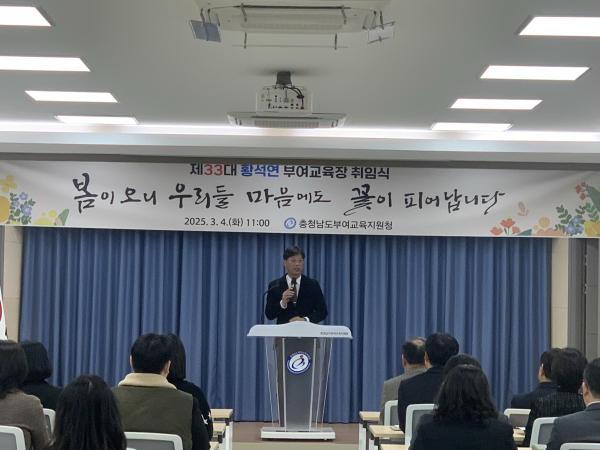 황 교육장은 취임사에서 “시대 변화를 반영한 교육으로 부여군 학생들의 성장과 발전뿐만 아니라 학생들이 삶의 궁극적 가치인 행복을 찾을 수 있도록 함께 노력하자”고 강조했다. 또한 “미래사회 핵심 키워드인 학생들의 주도성과 문제해결 능력을 함양하기 위해 기초학력 보장과 미래 역량 함양을 위한 교육 변화에 힘써 학생이 꿈꿀 수 있는 행복한 부여교육을 만들어 가겠다”고 포부를 밝혔다.