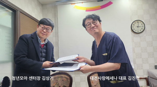 [충청뉴스 박영환 기자] '청년 플랫폼' 대전 중구 청년센터 청년모아(센터장 김상기)는 4일 비영리민간단체 대전사랑메세나(대표 김진혁)와 청년 생필품 및 의료품 지원을 위한 업무협약을 체결했다고 밝혔다.