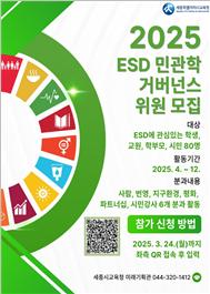 [충청뉴스 최형순 기자] 세종시교육청은 24일까지 ‘2025 지속가능발전교육(ESD) 민·관·학 거버넌스’(이하 거버넌스)에 자발적으로 참여할 학생, 교직원, 학부모, 세종시민 등 총 80명을 모집한다.