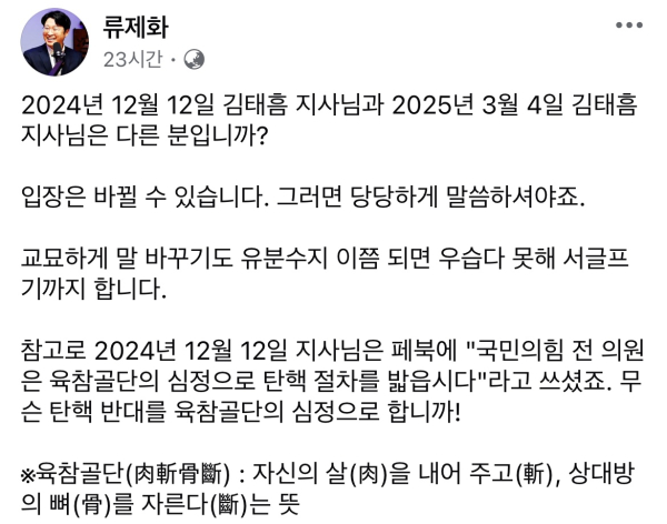 한편, 지난 4일 류제화 세종시갑 당협위원장은 본인의 SNS에 "2024년 12월 12일 김태흠 지사님과 2025년 3월 4일 김태흠 지사님은 다른 분이신가?"라며 “2024년 12월 12일 지사님은 페북에 '국민의힘 전 의원은 육참골단의 심정으로 탄핵 절차를 밟읍시다'라고 쓰셨다. 무슨 탄핵 반대를 육참골단의 심정으로 하는가"라는 내용을 실은 바 있다.
