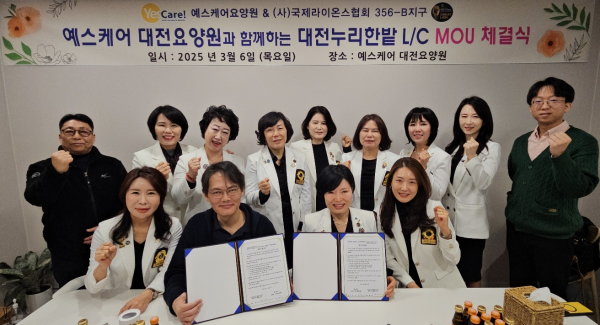 [충청뉴스 최형순 기자] 대전 지역 어르신들의 건강한 노후를 지원하기 위해 예스케어 요양원·주간보호센터(대표 조민)와 (사)국제라이온스협회 356-B지구 대전누리한밭 L/C(회장 변규리)가 손을 맞잡았다.