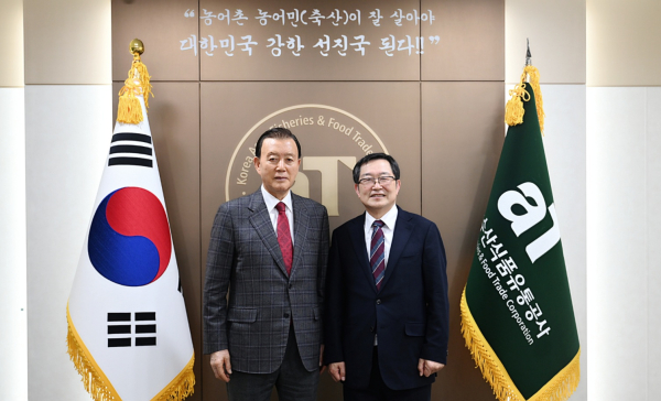 [충청뉴스 최형순 기자] 한국농수산식품유통공사(aT) 홍문표 사장은 6일 서울 양재동 aT센터에서 전쟁기념사업회 백승주 회장을 만나 K-푸드 수출을 통한 대한민국 식품영토 확장과 양 기관의 협력방안에 대해 논의했다.