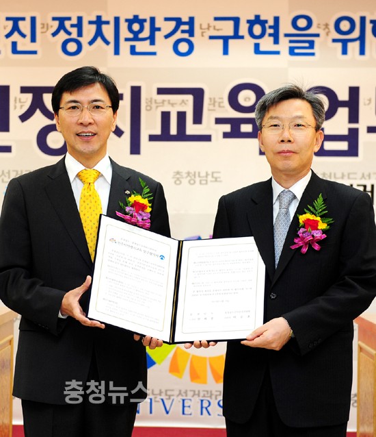 안희정 충남도지사는 9일 도선거관리위원회 대회의실에서 이승훈 도 선관위원장과 ‘공명선거 추진 기반 마련을 위한 민주시민 정치교육 업무 협약’을 체결했다.