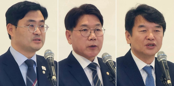 (왼쪽부터)이정문·이재관·문진석 국회의원이 ‘충남 도로·철도 국가계획 반영을 위한 정책토론회’에 참석해 발언하고 있다./사진=박동혁 기자