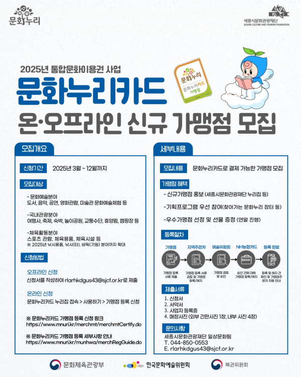 [충청뉴스 최형순 기자] 세종시문화관광재단(대표이사 박영국)은 저소득층의 문화 향유 기회를 확대하고 지역 경제 활성화를 도모하기 위해 문화누리카드 신규 가맹점을 모집한다.