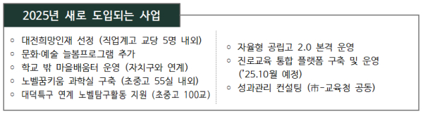 2025년 새로 도입되는 주요 사업으로는 초·중급 숙련인재 양성을 위해 직업계고 학생 대상 「대전희망인재」를 선정하고 지역연계 교육·늘봄사업으로 「지역연계형」거점형 늘봄센터를 과대(밀) 학교 지역 및 늘봄 수요가 많은 지역에 문화·예술 프로그램을 신설 지원하며, 「학교 밖 마을배움터」 운영으로 지역사회가 보유한 인적·물적 자원을 활용하는 교육과정 운영 및 방과 후 프로그램을 제공하여 학생 성장을 지원할 계획이다.