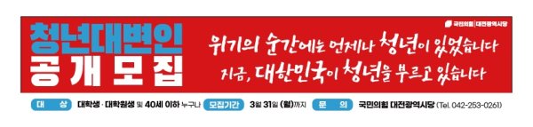 [충청뉴스 김용우 기자] 국민의힘 대전시당(위원장 이상민)은 대전지역 청년의 목소리를 대변할 청년대변인 공개모집을 진행한다.