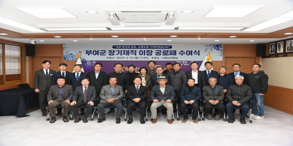 [충청뉴스 부여 = 조홍기 기자] 부여군(군수 박정현)은 지난 10일 오랜 기간 마을을 위해 헌신한 이장들의 노고를 기리기 위해 ‘장기재직 이장 공로패 수여식’을 개최했다.