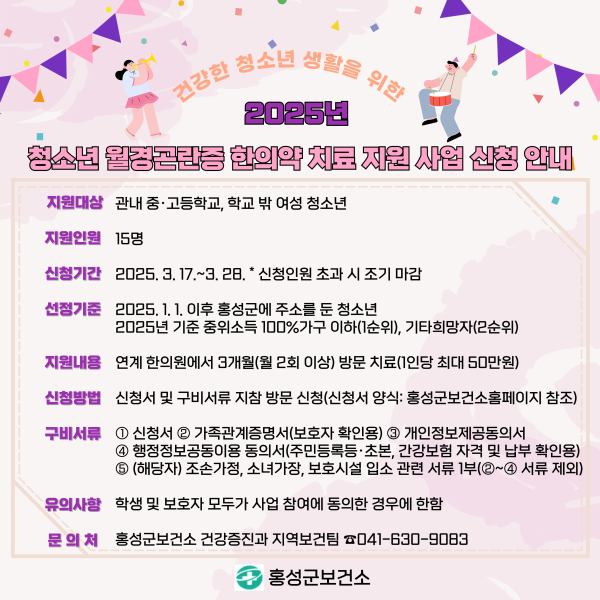 [충청뉴스 권상재 기자] 홍성군보건소에서 청소년의 건강한 성장을 돕기 위해 ‘청소년 월경곤란증 한의약 치료지원 사업’의 대상자를 모집한다.