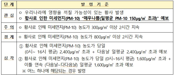도는 황사 위기경보 관심 단계 발령 직후 시군 및 관계 기관에 상황을 전파하고, 황사 발생 대비 국민행동 요령에 따라 대응해 줄 것을 요청하는 동시에, 취약계층에 SNS 등을 통해 국민행동 요령을 안내했다.