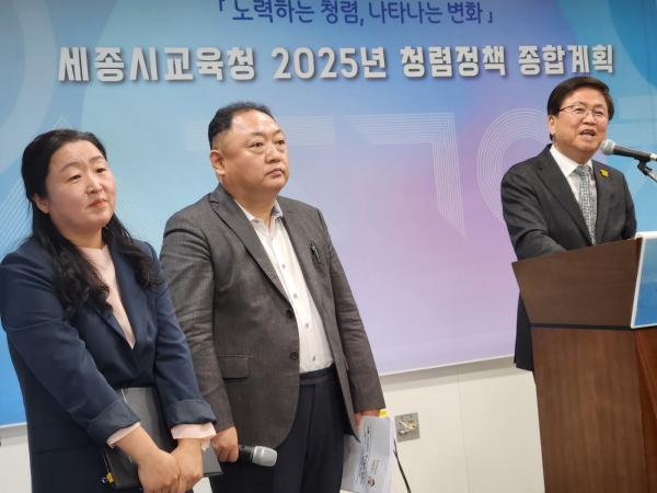 기자회견 하는 최교진 세종시교육감과 최호열 감사관과 관계자
