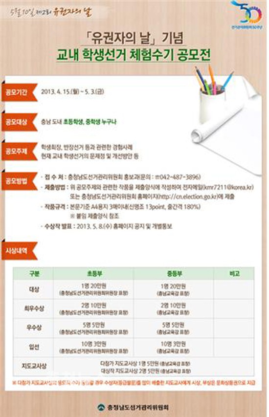 이번 체험수기 공모전 작품은 15일부터 5월 3일까지 접수하며, A4용지 3매 이내의 한글파일로 작성하여 전자메일(kmr7211@korea.kr) 또는 충청남도선거관리위원회 홈페이지(http://cn.election.go.kr)에 접수하면 되고, 당선작은 5월 8일 발표할 예정이다.