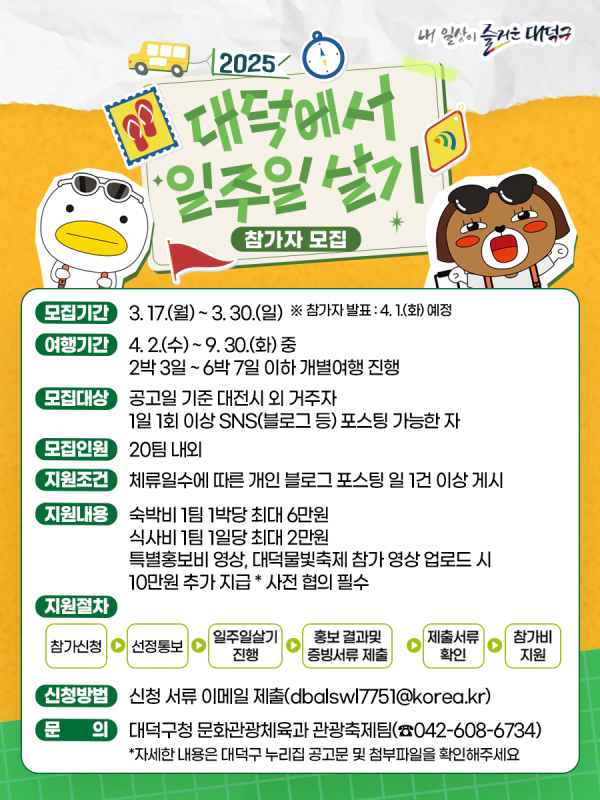 [충청뉴스 박영환 기자대전 대덕구는 오는 30일까지 ‘2025 대덕에서 일주일 살기’ 참가자를 모집한다고 밝혔다.