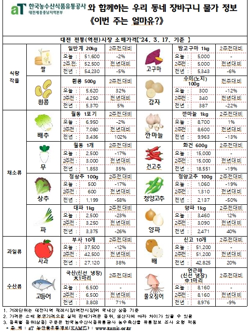 [충청뉴스 최형순 기자] 한국농수산식품유통공사 대전세종충남지역본부(aT, 지역본부장 장서경)는 대전 지역 농수산물 소비자들의 합리적인 구매를 지원하고 전통시장 활성화를 위해 '이번 주는 얼마유?'(3월 넷째 주) 장바구니 물가정보를 발표했다.