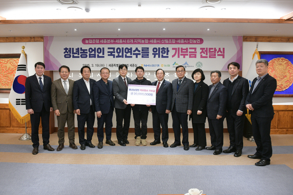 세종시(시장 최민호)는 19일 시청 5층 세종실에서 청년농업인 국외연수 지원을 위한 기부금 전달식을 개최했다.
