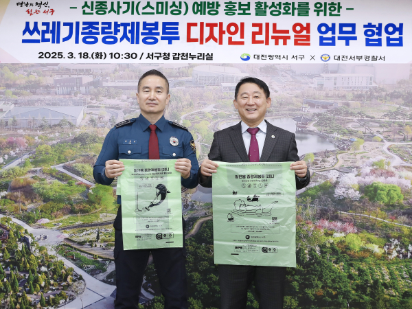 [충청뉴스 박영환 기자] 대전 서구청는 지난 18일 구청 갑천누리실에서 대전서부경찰서와 쓰레기 불법투기 과태료 관련 스미싱 예방을 위한 업무 협업을 체결했다고 밝혔다.
