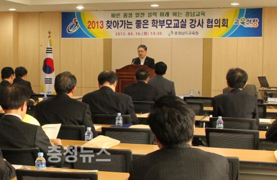 충남교육청(교육감 권한대행 부교육감 전찬환)은 학부모의 수요와 특성을 반영한 맞춤형교육 활성화를 위해 ‘2013학년도 찾아가는 좋은 학부모교실' 강사 협의회를 16일, 강사 49명을 대상으로 도교육청 7층 회의실에서 개최했다.
