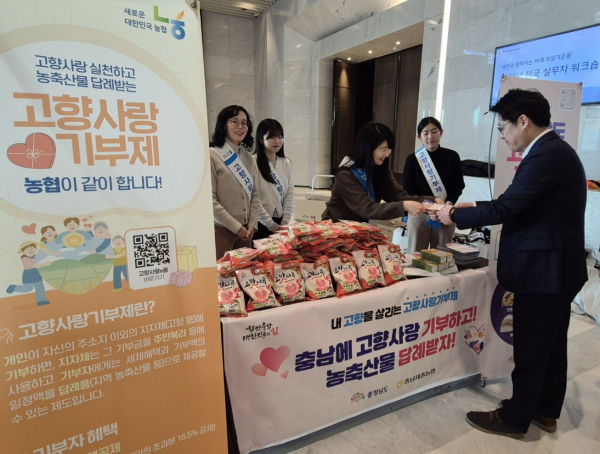 정해웅 본부장은 "올해는 우리 지역 지방재정에 큰 도움이 되는 고향사랑기부제를 더욱 적극적으로 홍보할 계획"이라며, "농협은 우리 지역의 우수한 농특산물이 답례품으로 선정될 수 있도록 상품 내실화와 차별화에 힘쓰겠다"고 밝혔다.