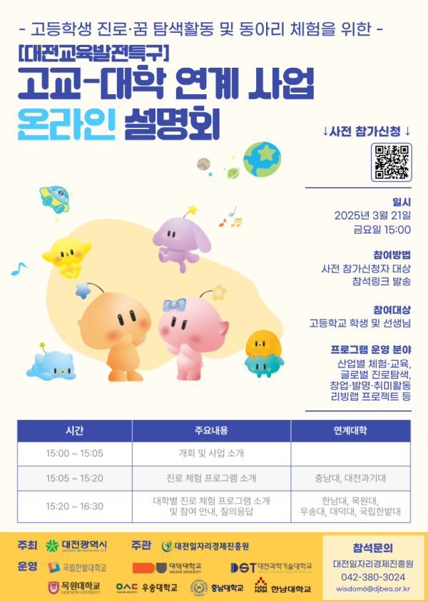 고교-대학 연계 인재양성 사업에 관심 있는 관내 고등학교 교사 및 학생들은 대전일자리경제진흥원(☎ 042-380-3024)으로 문의하면 된다.