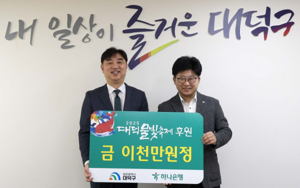 [충청뉴스 박영환 기자] 대전 대덕구는 20일 하나은행 충청영업그룹(부행장 이동열)으로부터 ‘2025 대덕물빛축제’의 성공적인 개최를 위한 후원금 2000만원을 기탁받았다고 밝혔다.