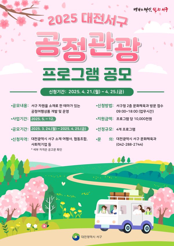 [충청뉴스 박영환 기자] 대전 서구는 ‘2025 대전 서구 공정관광 프로그램 공모사업’을 추진한다고 24일 밝혔다.