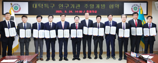 시는 24일 국가과학기술연구회를 비롯한 ▲한국표준과학연구원 ▲한국항공우주연구원 ▲한국과학기술정보연구원 ▲한국원자력연구원 ▲한국전자통신연구원 ▲한국에너지기술연구원 ▲한국기초과학지원연구원 ▲한국핵융합에너지연구원 ▲한국조폐공사 ▲한국타이어앤테크놀로지㈜(한국테크노돔) 등 총 11개 기관과‘대덕특구 연구기관 주말개방’ 업무협약을 체결하고, 대덕특구 연구기관 주말 개방의 본격적인 시작을 알렸다.
