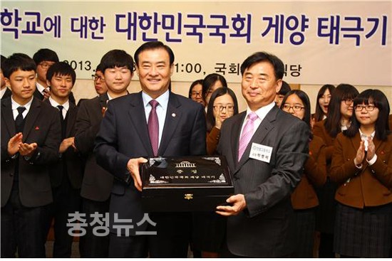 강창희 의장, 대전 한밭고에 국회 게양 태극기 증정