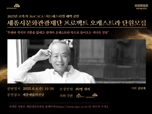 [충청뉴스 최형순 기자] 세종시문화관광재단(대표이사 박영국)이 2025 KoCACA 아트페스티벌 폐막공연에 참여할 ‘프로젝트 오케스트라’ 연주 단원을 오는 4월 20일까지 모집한다.
