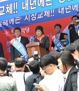 이어 박대표는 한나라당 으능정이 거리 유세에 참석, 당원과 지지자들에게 짤막한 연설을 한 후 자리를