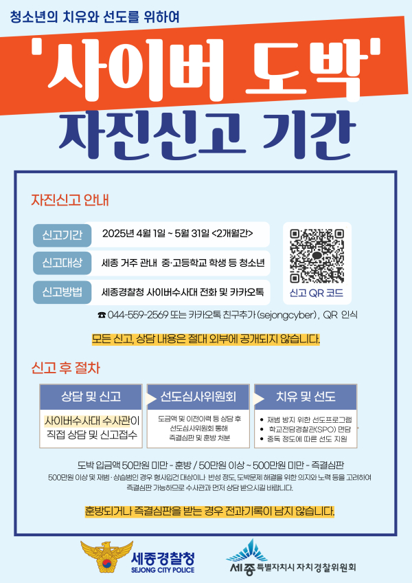 [충청뉴스 최형순 기자] 세종경찰청(청장 한원호)과 세종시자치경찰위원회(위원장 남택화)는 최근 심각한 사회 문제로 대두된 청소년 사이버 도박 문제 해결을 위해 4월 1일부터 5월 31일까지 두 달간 ‘청소년 사이버 도박 자진신고’ 기간을 운영한다.