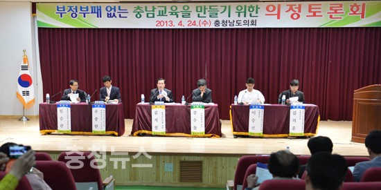 충청남도의회(의장 이준우)는 24일 홍성도서관에서 충남교육계 인사비리 관련 “부정부패 없는 충남교육을 만들기 위한 의정토론회”를 개최했다.