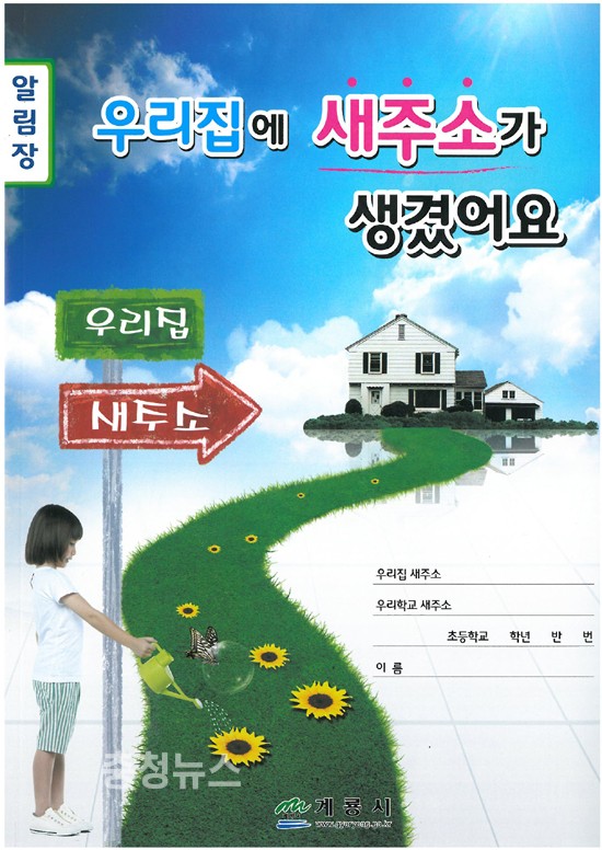 계룡시(시장 이기원)는 내년부터 전면 시행예정인 도로명주소를 초등학교 학생들에게도 쉽게 알려주기 위해 알림장을 제작.배부하고 도로명 주소에 대한 홍보활동을 펼쳤다.